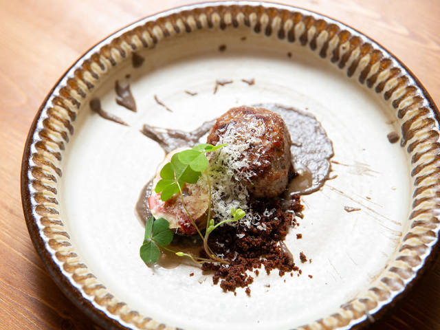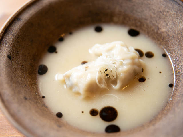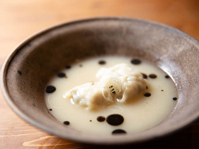 ちなみにこの水餃子、コースメニューには「ホロホロ鶏と発酵野菜」としか記されていない。メニュー表には、食材しか記載しないのが『nou』流。「音楽アーティストのアルバムに記載された曲名のように、キーワードから想像力を膨らませてもらいたい」という想いが込められている。