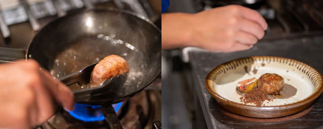 クレピネット(豚の網脂)で包まれたイノシシのハンバーグの中には肝やレバー、プリプリの脂身が入っている。