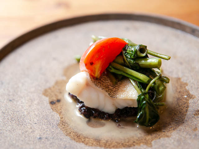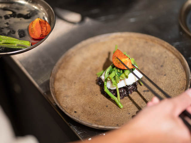 「酒も米、黒米も米なので合うんですよ」(宮地さん)というように、芳醇な酒の香りとうまみをまとったクエにオリエンタルな黒米がよく合う。苦味と酸味、食感の良い空芯菜がまたアクセントになっていて味に奥行きが出ている。