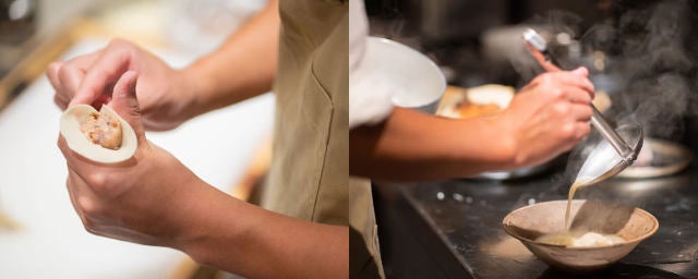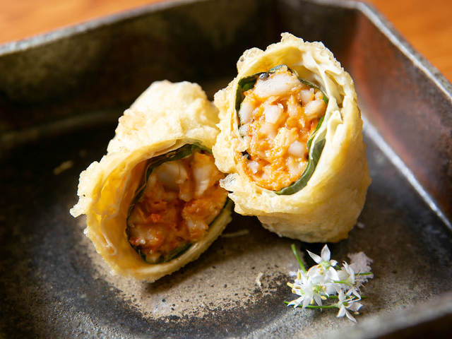 この日のコースで登場したこちらの「天ぷら」(写真上)は、ウニ、毛蟹、キャビアなどの海鮮をタルタルのようにしてから大葉で巻いた一品。さらに、一般的な湯葉よりかためな食感の「たぐり湯葉」を巻いて揚げることで、サクサクの衣をまとった湯葉の中から、レアな状態の濃厚な海の幸があふれ出る。