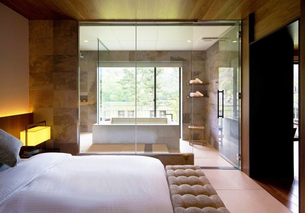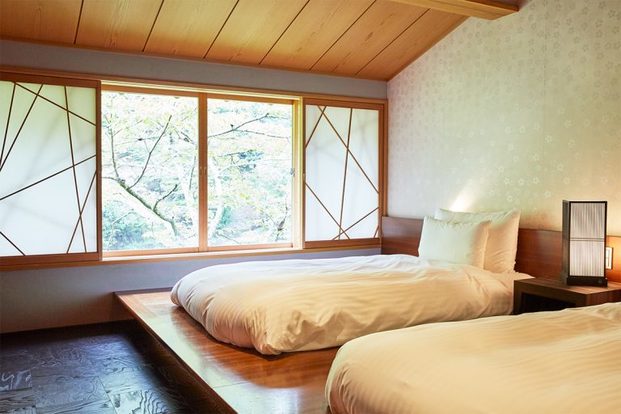 富士箱根伊豆国立公園の一角、木々のアプローチを進んだ先に緑と調和するように佇む宿。〝森の中の進化形リゾートとして隠れ家(リトリート)になれば〞との思いがこめられている。3棟ある客室はどこも、目の前に森の緑が広がり、葉を揺らす風を肌で感じ、鳥の声にやさしく包まれる。