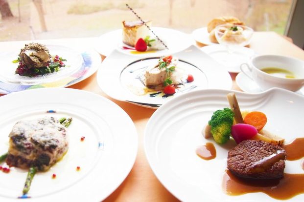 食事は季節の野菜をはじめ、くぬぎ鱒や幸寿豚など地元食材を使った薪火料理がシェフの自慢。