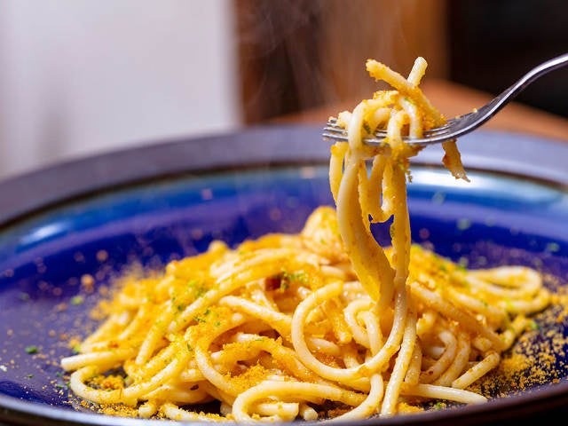 うまみの塊のようなパスタで、パンチの効いた辛みもあり、フォークが止まらないうまさだ。これもまた、ワインがぐいぐい進む味。だしに塩味があるので、カラスミは塩分控えめのものを使用している。