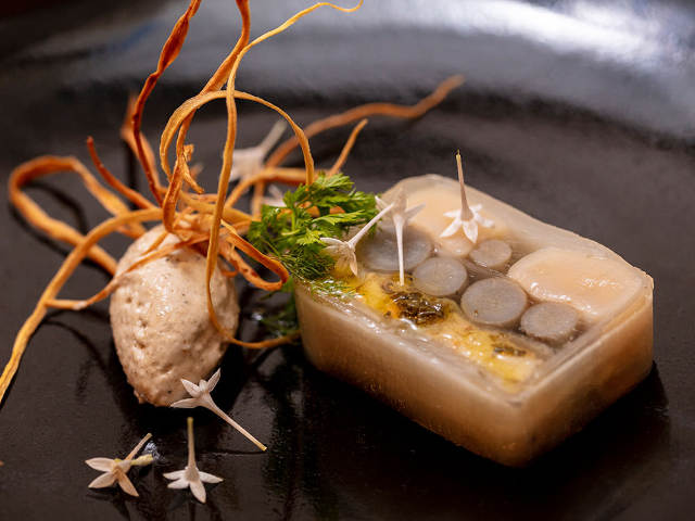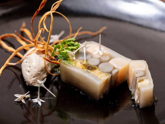「ホタテとごぼうのテリーヌ きのこの香りのムース」(写真上)は三層仕立て。下の層はさまざまな風味をつけて煮たホタテ、中の層はカツオだしで煮たゴボウ、上の層はさっと湯引きしたほぼ生のホタテ。それを、だしでやわらかく煮た大根で包んでいる。