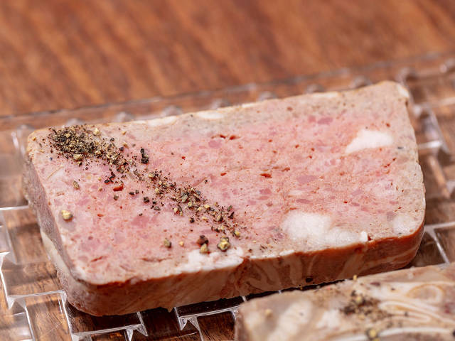 「豚肉のコラーゲンパテ」(写真上)は、豚肉のコラーゲンが豊富な部位4種類を使用し、自然に固めている。味付けは塩のみというシンプルさだが、コリコリしたコラーゲンを噛むたびに中からうまみが染み出てくる。