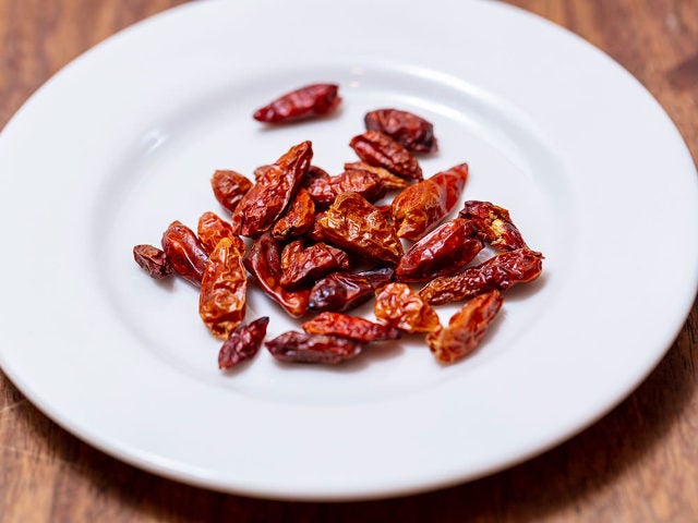 麺に沁み込んだソースは、イタリア南西部のカラブリア地方産の香りのいいトウガラシ「ペペロンチーノ ピッコロ」(写真上)とニンニクをオリーブオイルで炒め、アサリのだしと昆布だしを合わせたもの。