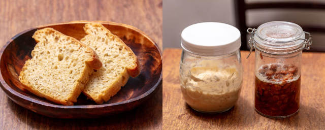 「レバーパテ」や「ゴルゴンゾーラとハチミツのムース」にぜひ合わせたいのが、「自家製フォカッチャ」(写真上・左)。伊藤さんが、レーズンを使って酵母菌(同右)から育てて焼いているこだわりのパンで、ほどよい塩味と自然のほのかな酸味、さっくりした食感が、パテやムースのなめらかさをさらに増幅させる。