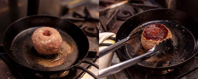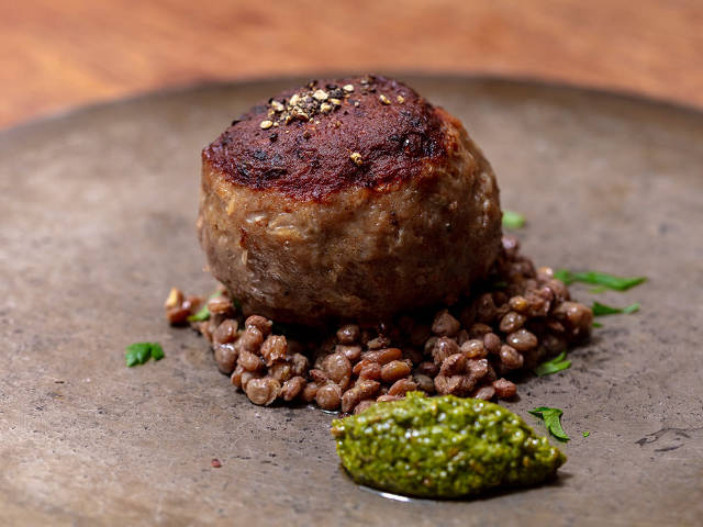 ほぼ球形のダイナミックなフォルムの「粗挽きラムハンバーグ 自家製アリッサペースト」(写真上)は、粗挽きのラム肉にニンニクやタマネギ、パン粉、クミンを加え、20分ほどかけてじっくり焼きあげている。