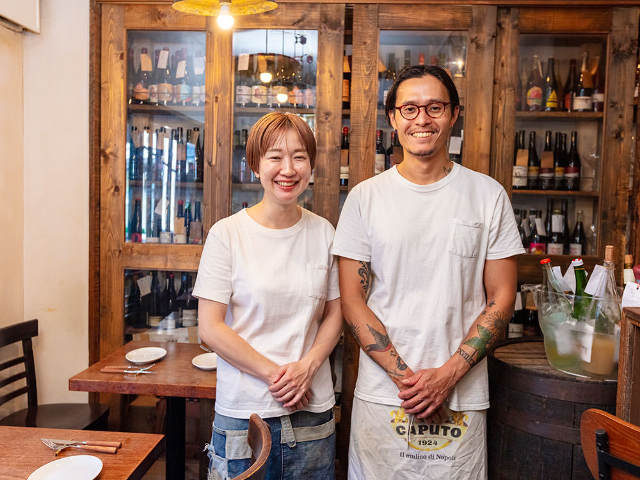 シェフの小淵卓也さん(写真上・右)と、ソムリエの伊藤香菜さん(同左)。ふたりとも、『ワイン食堂 レインカラー』の元常連。それだけに、店とお客への愛情はひとしおだ。