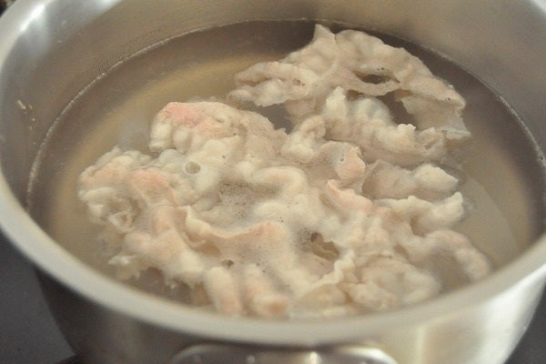 1、鍋にたっぷりの湯を沸かして豚バラ肉をゆでる。ザルに上げて冷水に放ち、水気を絞って幅4cmに切る。