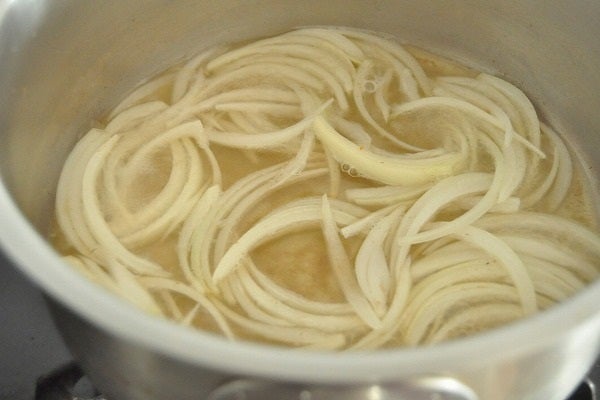 2、鍋に<合わせだし>の材料と玉ネギを入れて強火にかけ、煮たったら弱めの中火でしんなりするまで煮る。