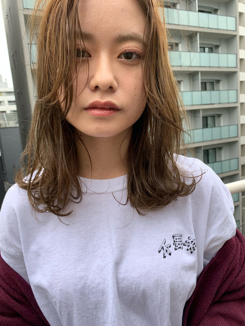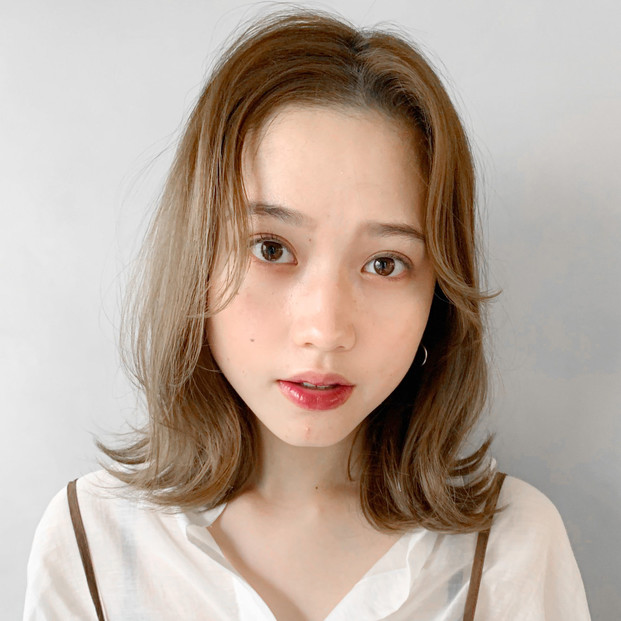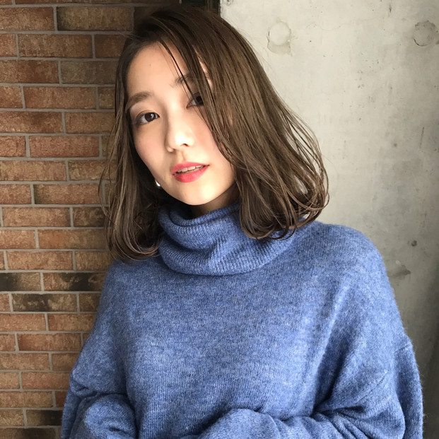 透明感のあるアッシュ系カラーでサラサラな質感に。毛先をワンカールさせることで、シンプルな可愛さが生まれる。