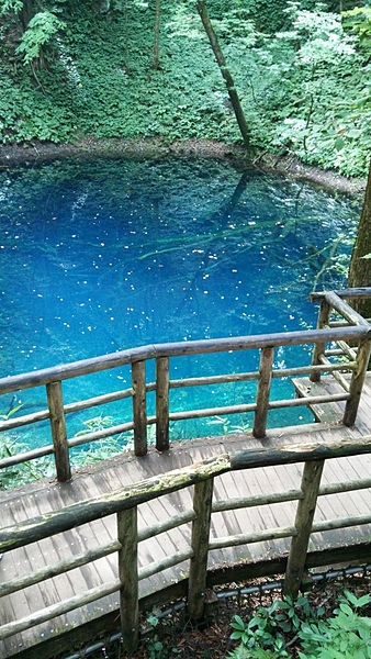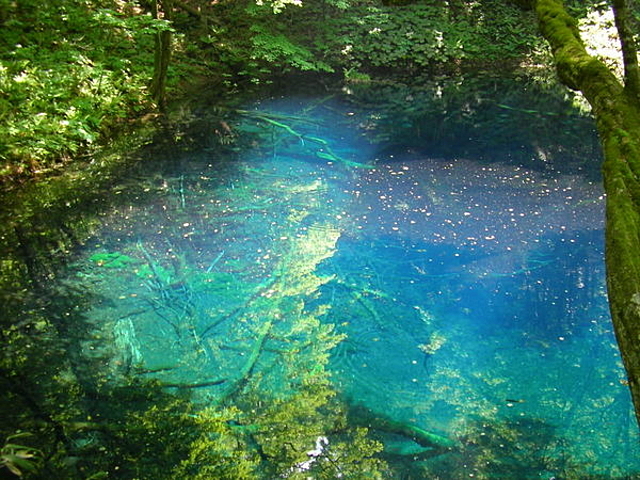 春から夏にかけて明るい青、秋にかけて濃くなる。冬は黒く見える。十二湖で最も人気のある池である。