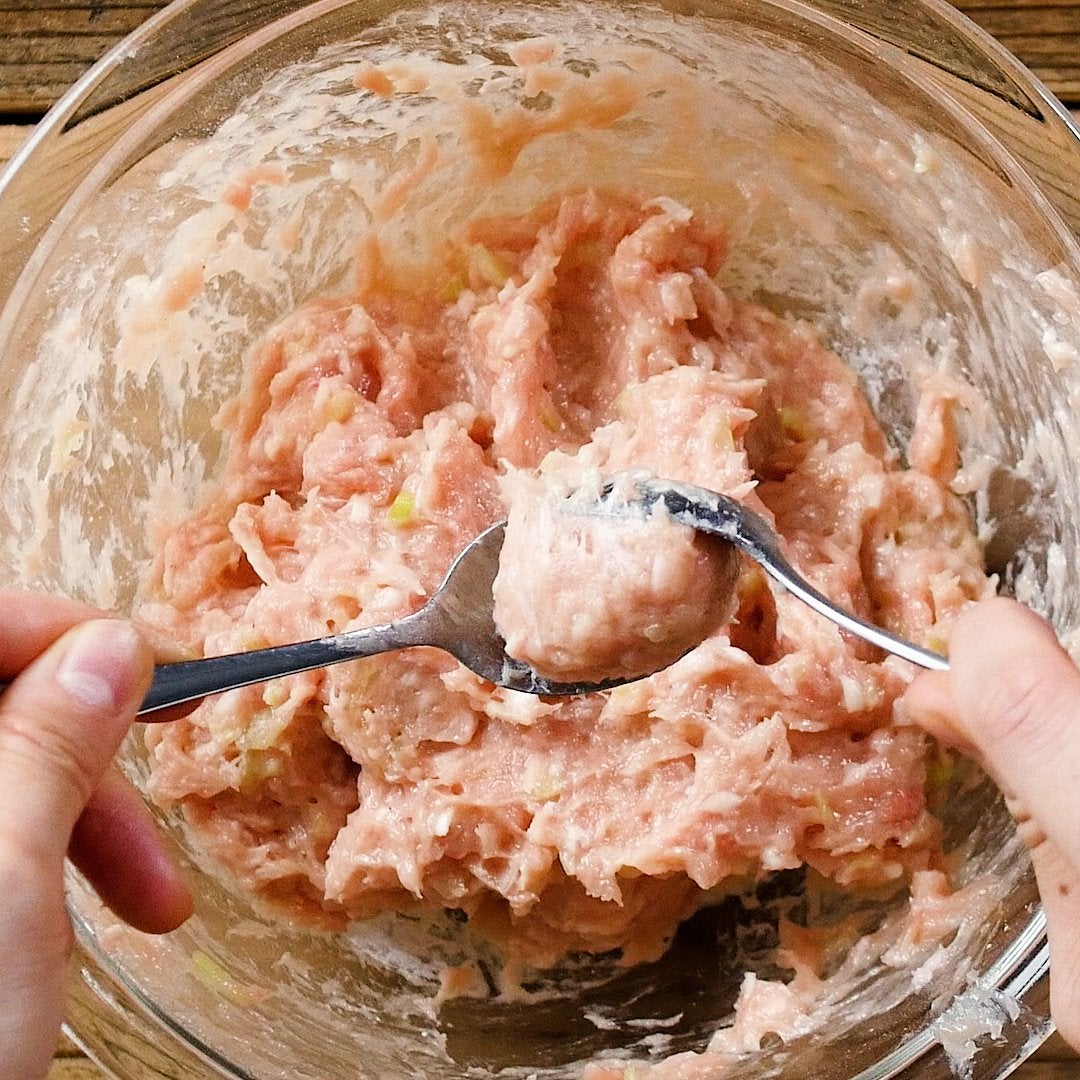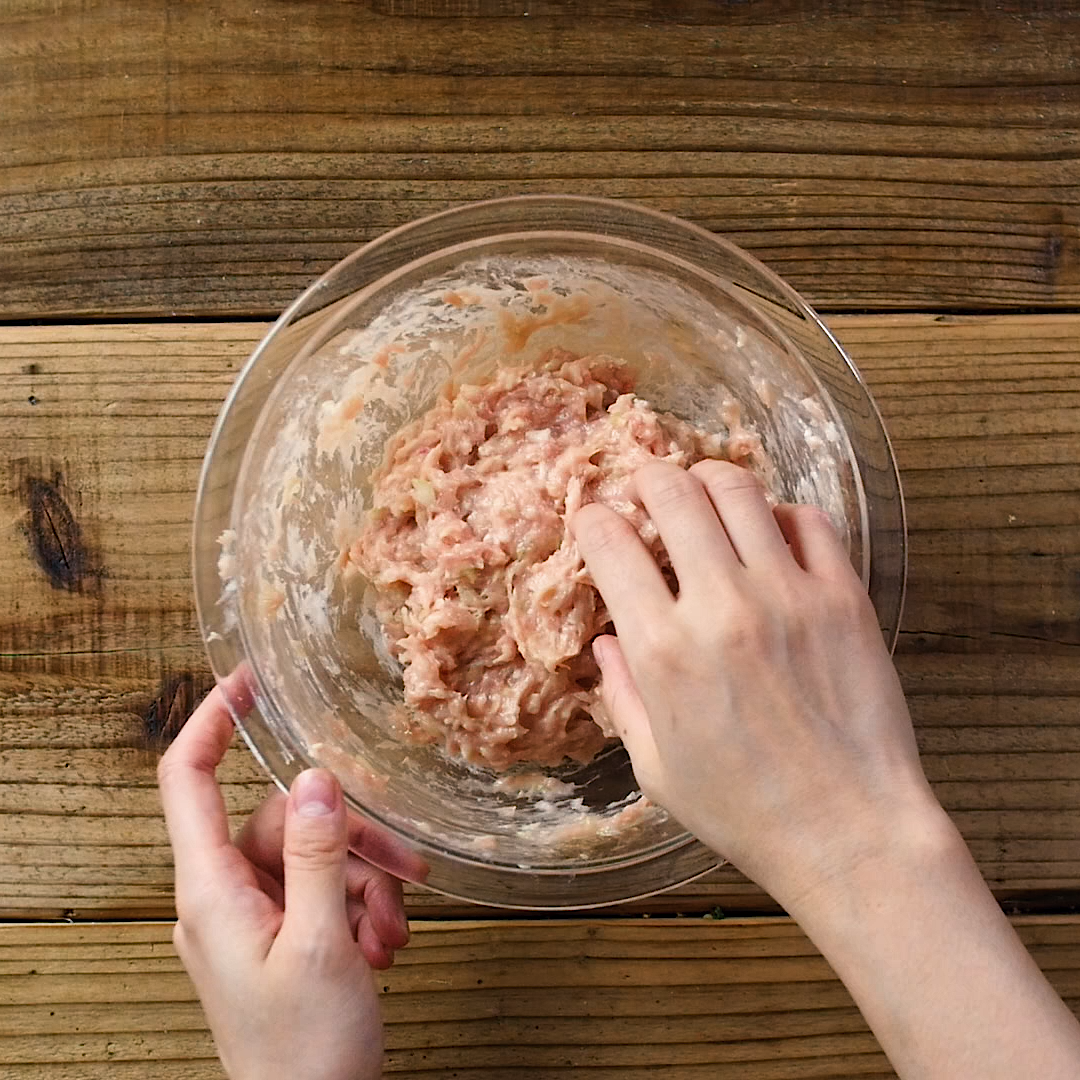 ボウルに鶏ひき肉、味付塩こしょうを加えて粘りが出るまで混ぜ合わせます。長ねぎ、しょうが、卵、片栗粉を加えてさらに混ぜ合わせます。