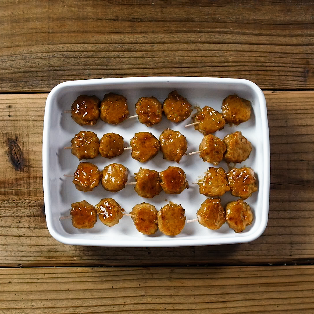 ・肉だねはしっかり粘りが出るまで混ぜ合わせるのがポイントです。固さが足りない場合は、片栗粉の量を増やしてください。焼くと肉だねの固さが安定するので、串刺ししやすいですよ。・大きめに成形して焼いていただくのも構いません。