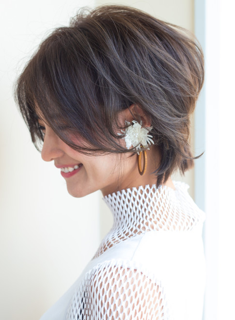 長めに残した前髪を、深い位置から斜めに流したショートスタイル。片側を耳にかければ色っぽさ満点、グッと大人っぽい雰囲気になります。ボリュームを出すところとタイトにするところ、このメリハリを意識してセミウェットに仕上げます。