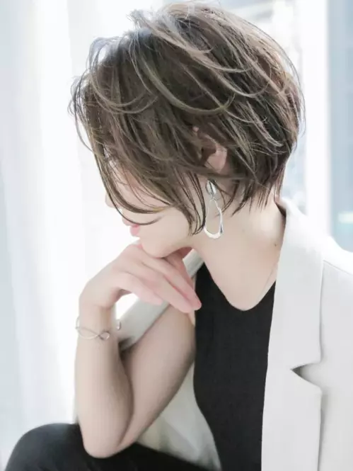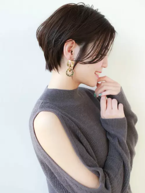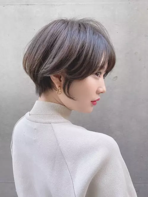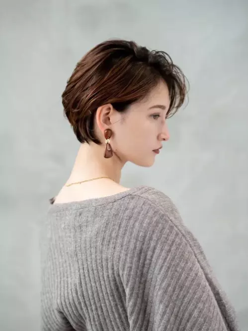 ゆるやかな前下がりの小顔ショート。襟足や耳周りはスッキリしつつも表面の髪の毛と前髪は少し長めに残すのがポイントです。そうすることでメリハリのあるシルエットになり、ハンサムなのに上品さを感じる、レディな雰囲気になります。