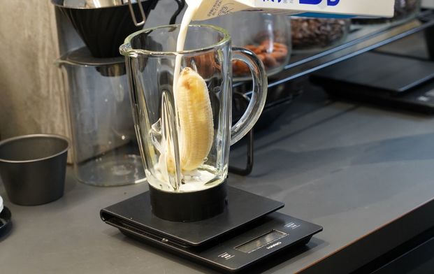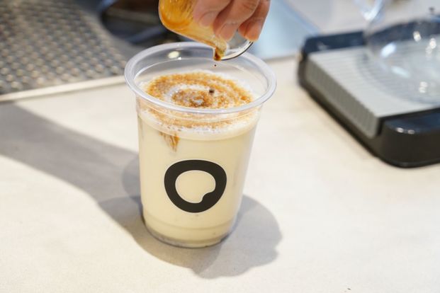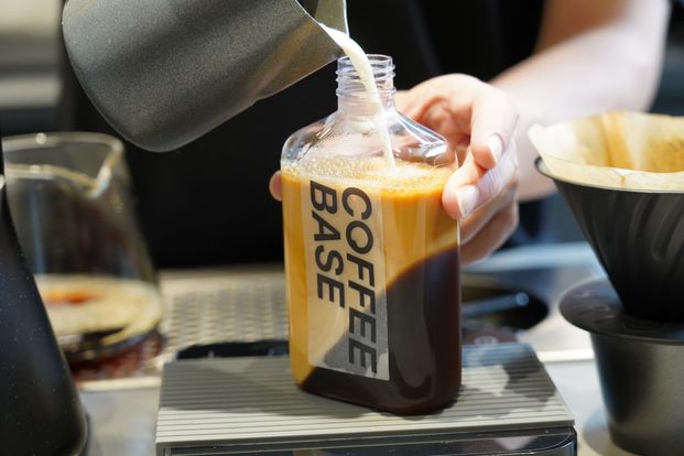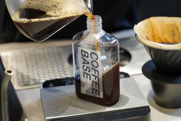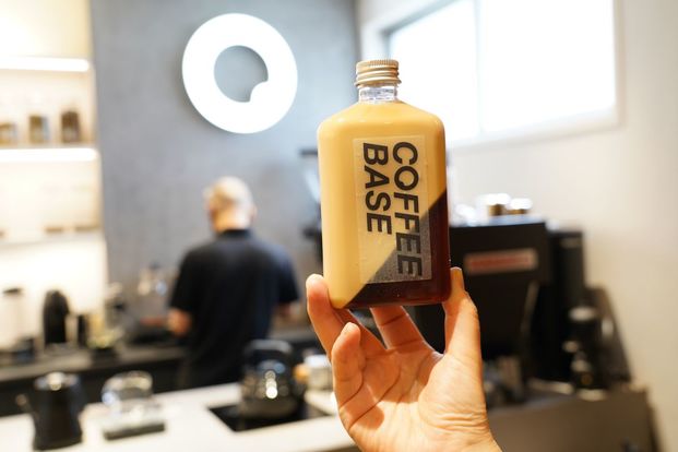 『Coffee Base KANONDO』の広告塔ともいえる看板メニューが、この斜めツートンカラーの「コーヒーゼリー」。持ち歩きやすいボトルで、街歩きにもぴったり。しかも、作り置きではなく…。