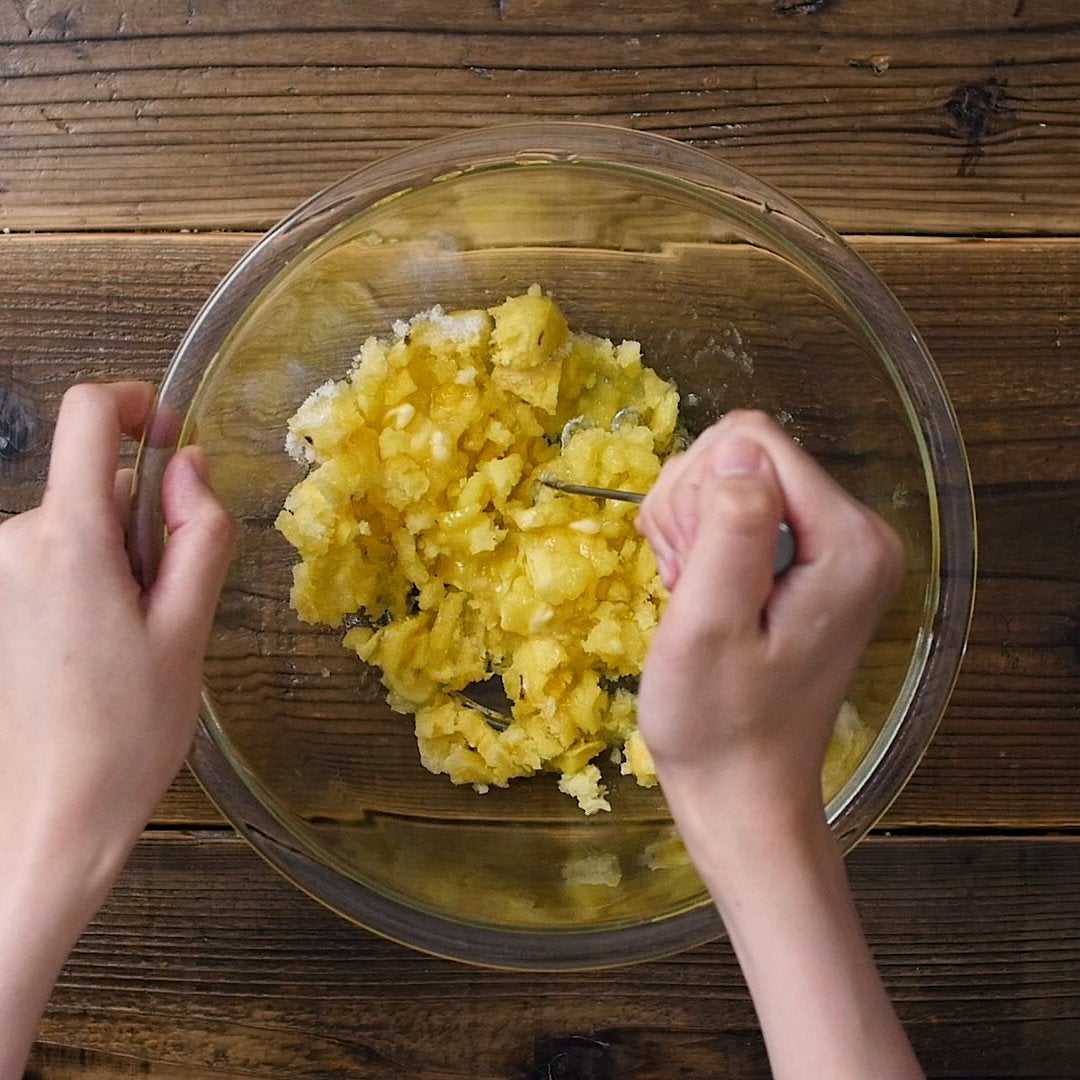 レンジから取り出してバター、グラニュー糖を加え、マッシャーでなめらかになるまで潰します。