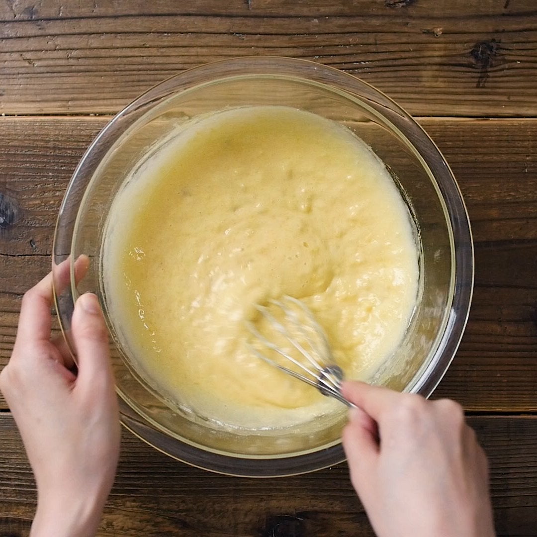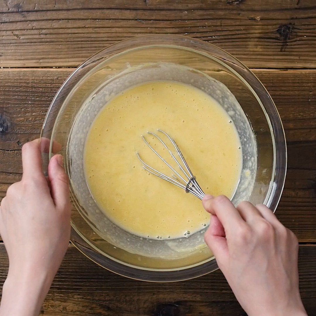 溶き卵、牛乳をそれぞれ少量ずつ加え、その都度よく混ぜ合わせます。