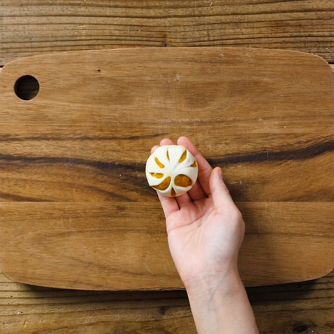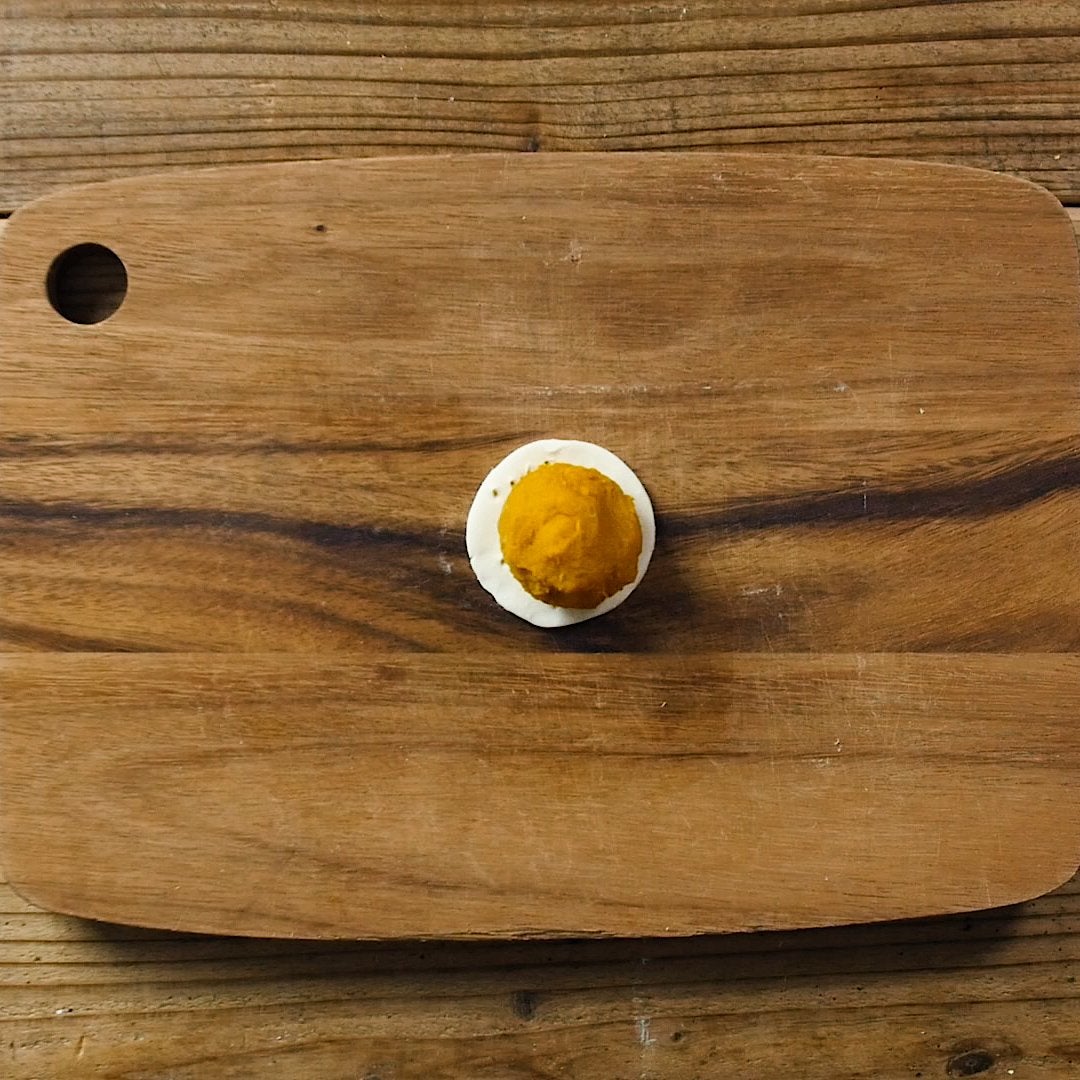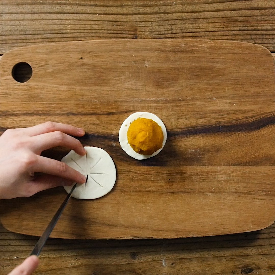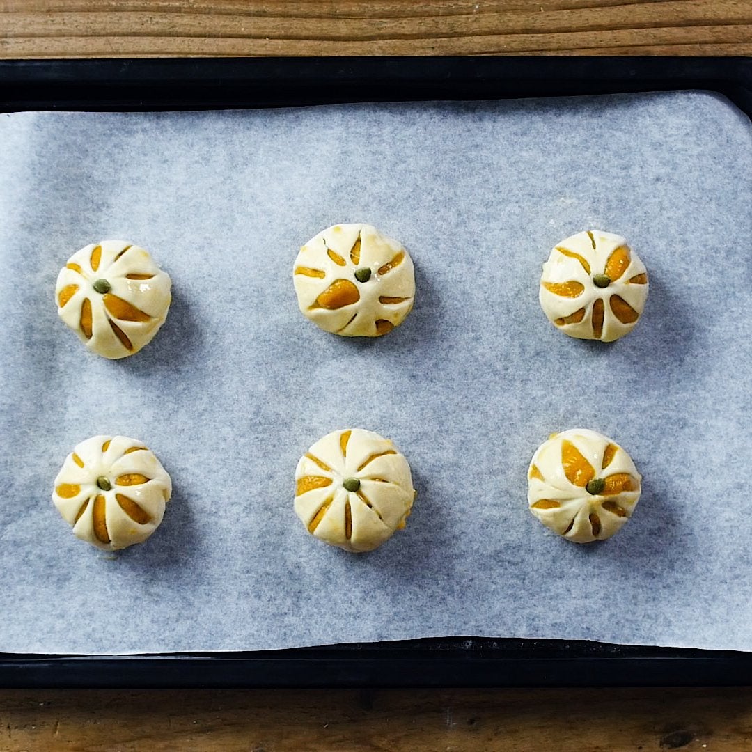 縁に溶き卵を塗り、⑤をかぶせて折り込み、中心にかぼちゃの種を刺します。※かぶせて折り込む際はしっかりと生地同士を密着させると、焼いているときに生地がはがれにくいです。