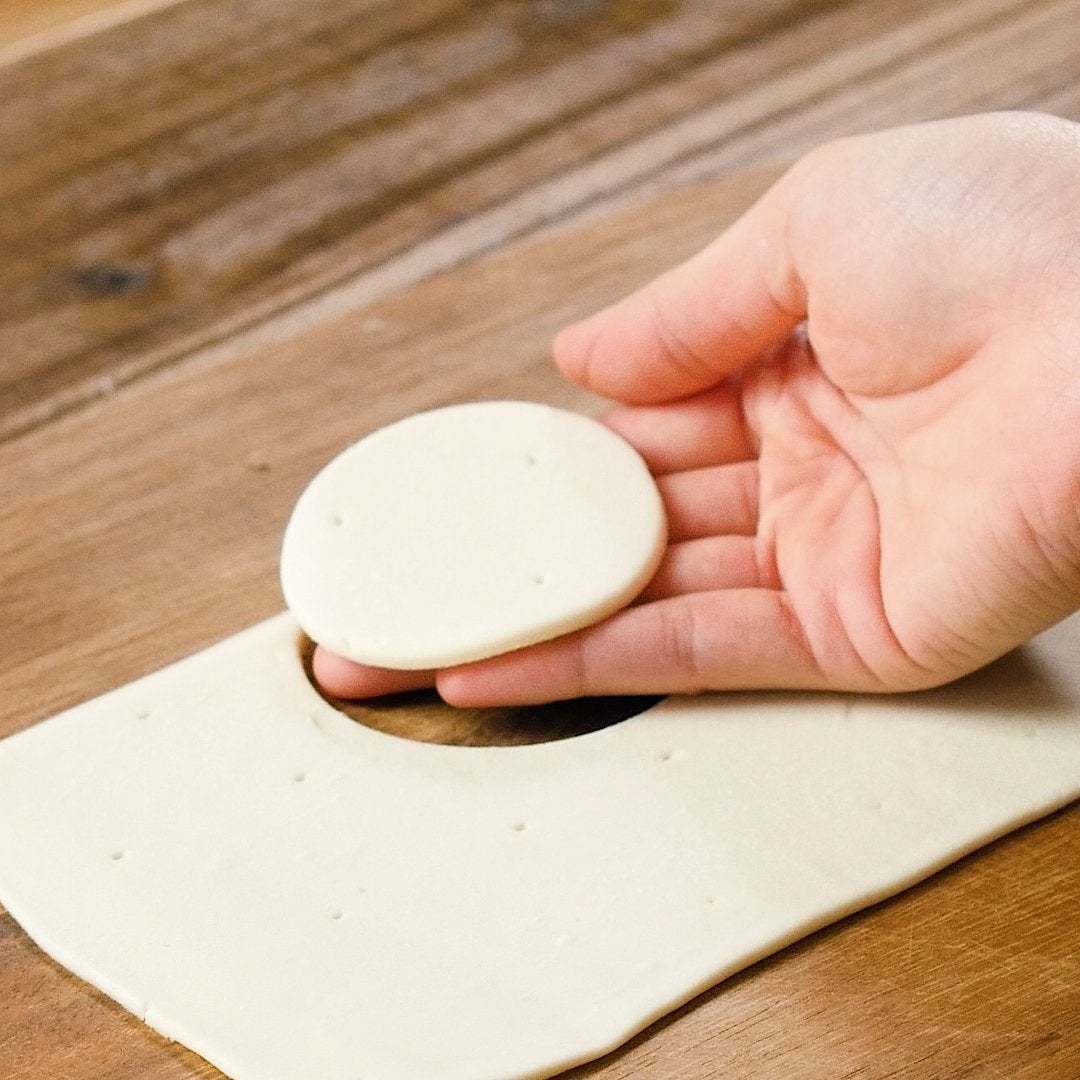 パイシートは、薄く伸ばして4.5cmと6cmのセルクルでそれぞれ6枚ずつ型抜きします。※セルクルがない場合は、牛乳パックを細く切って丸く成形し、アルミホイルで覆っていただくと代用できますよ。