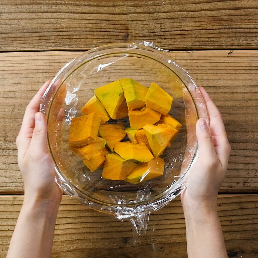 耐熱ボウルにかぼちゃを入れてふんわりラップをかけ、レンジ600Wで5分加熱します。