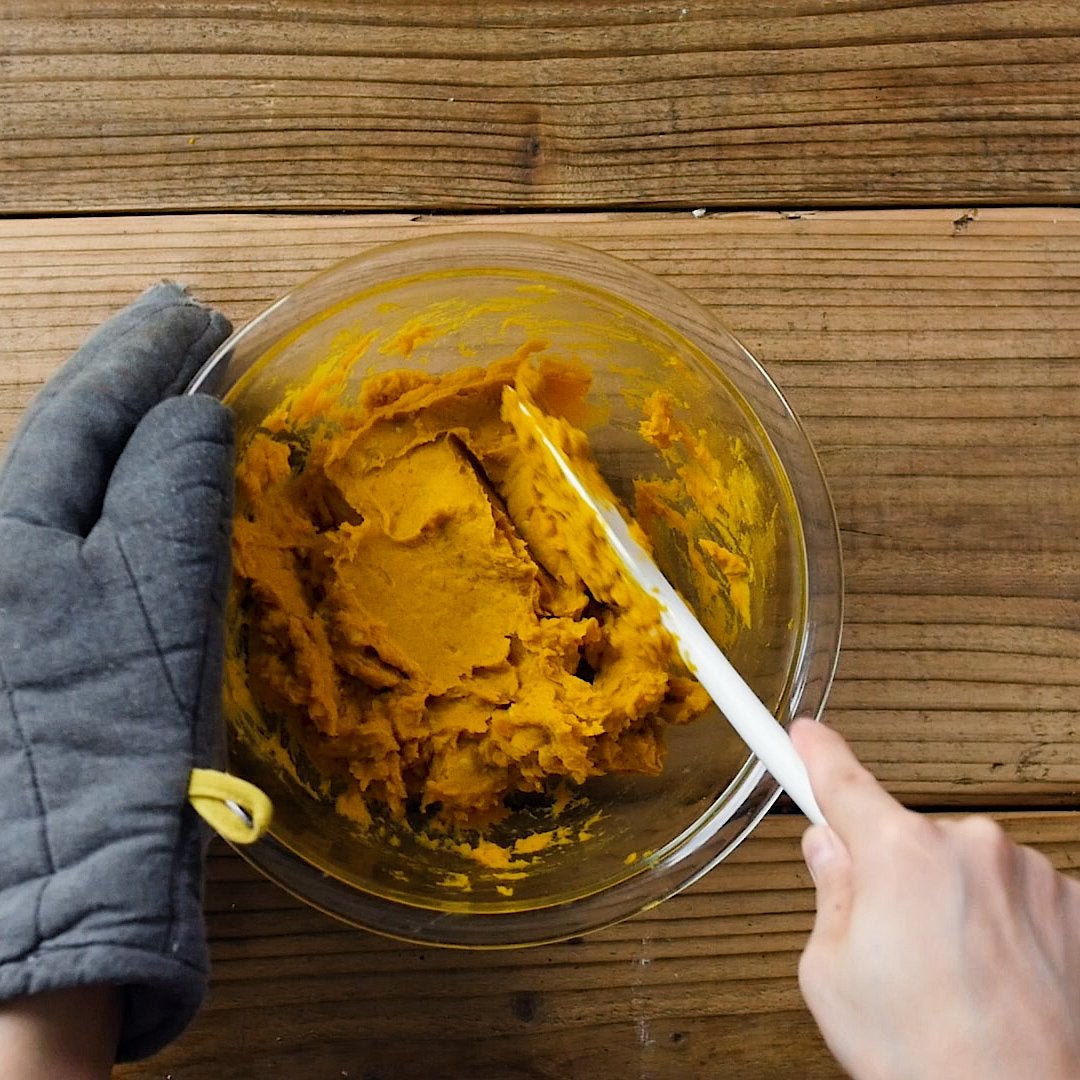 マッシャーでつぶし、砂糖、無塩バターを混ぜ合わせます。牛乳、砕いたクルミ、シナモンパウダーを加えて軽く混ぜ合わせます。6等分し、ラップに包んで丸く成形しておきます。