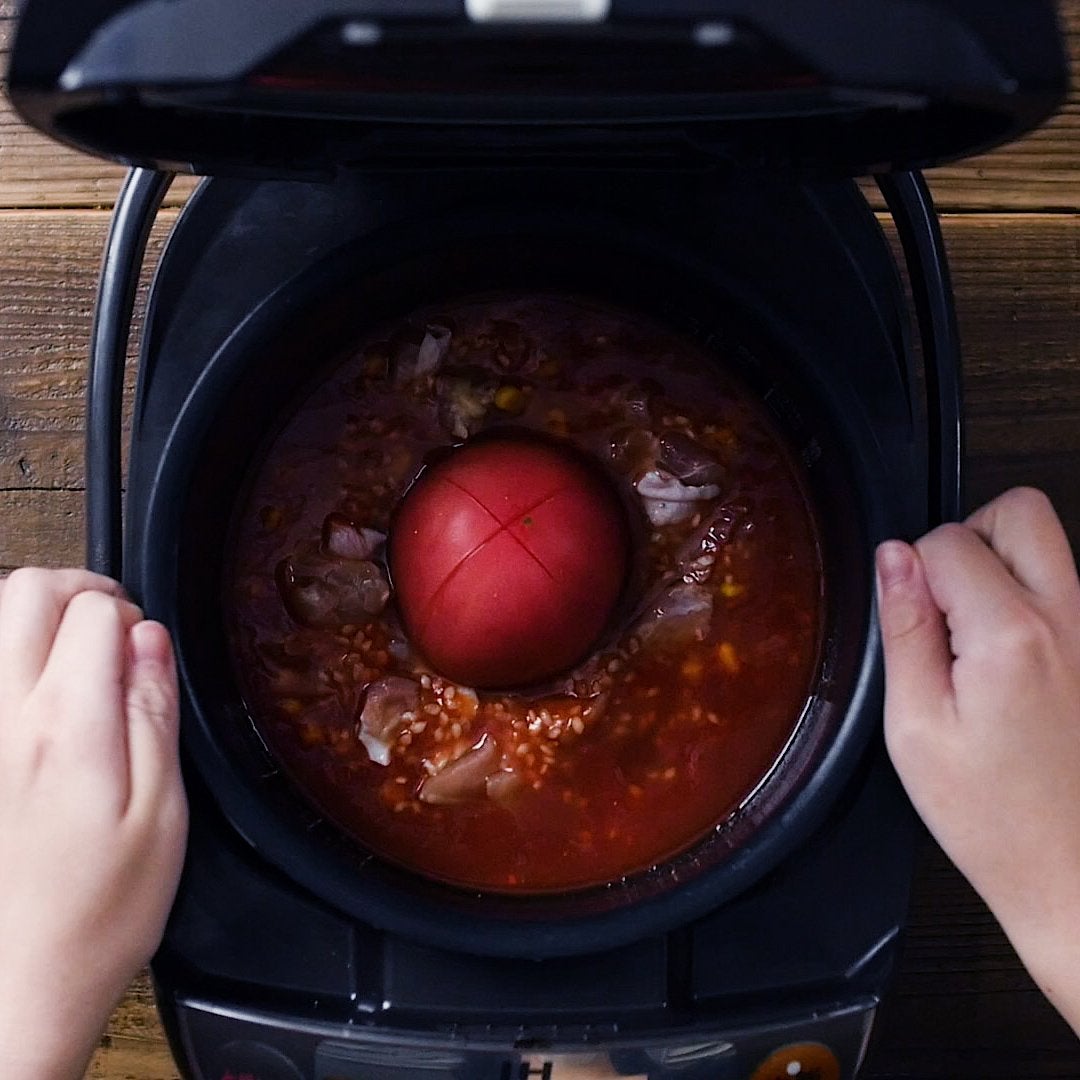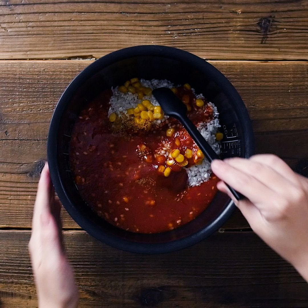 炊飯釜に米、コーン缶、(a) の材料を入れ、トマトジュースを注ぎます。