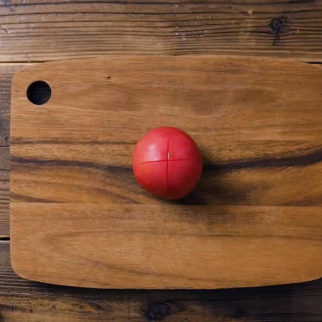 トマトのヘタを切り落として、逆さにして十字の切り込みを入れます。鶏もも肉は1cm角に切ります。