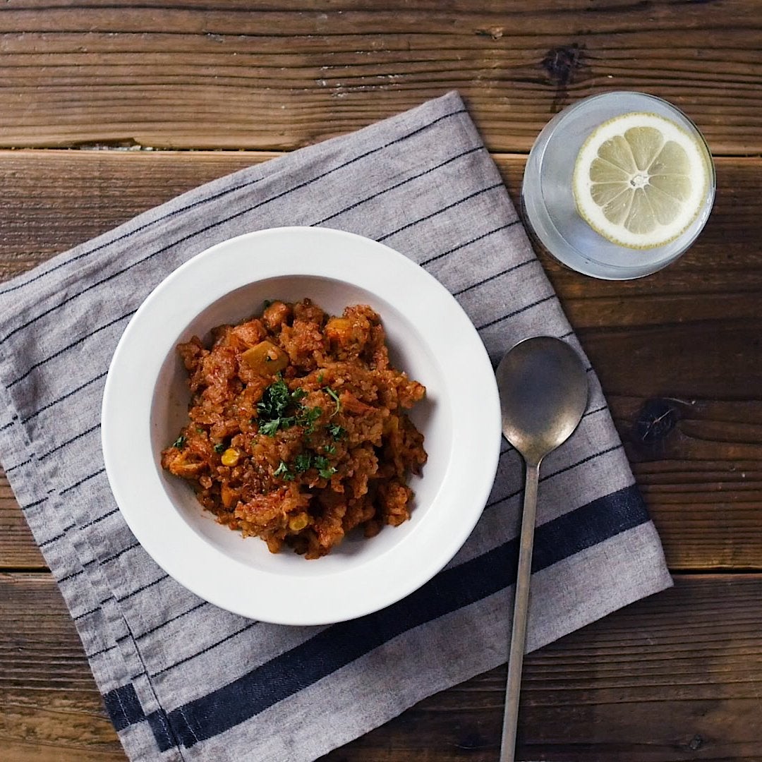 炊き上がったら、バターを加えトマトを潰しながら全体を混ぜ合わせ完成です。器に盛り付けパセリを散らしてくださいね。