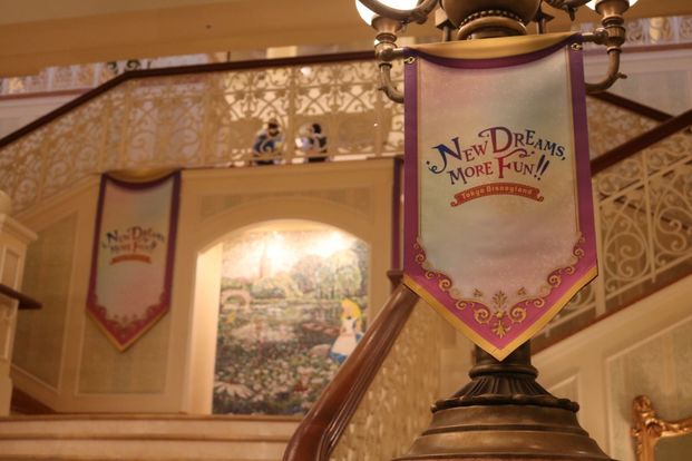 「東京ディズニーランドホテル」のパーク側から入ると、ロビーフロアに上がる階段に大きなバナーが。記念デコレーションはロビーを中心にいたるところに飾られていました!