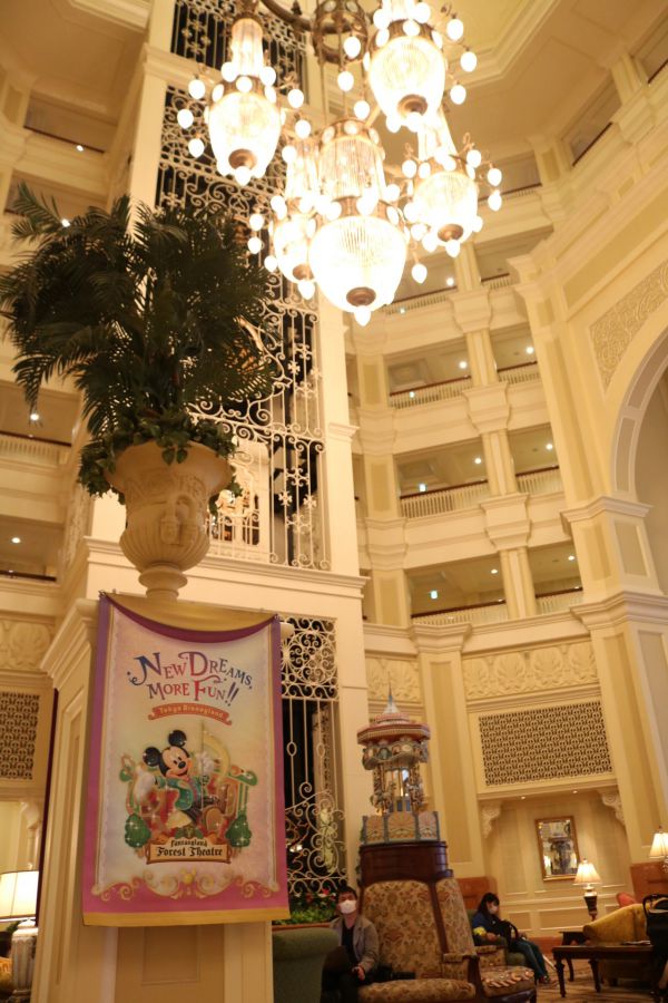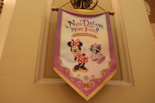 例えばミッキー、ミニーのスタチューや、ロビーの柱など、ロゴのほか、各施設のデザインしたバナーがあるので探してみても楽しいですよ。
