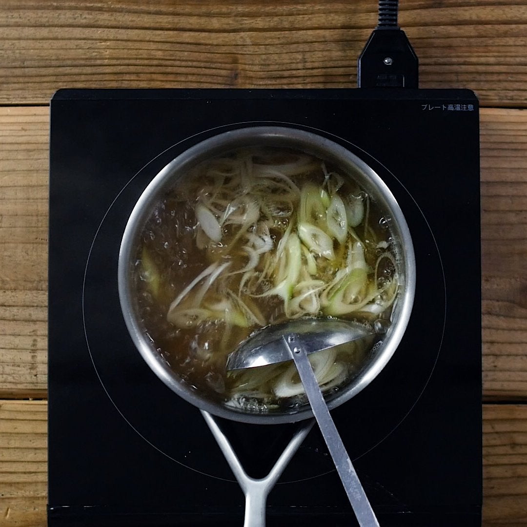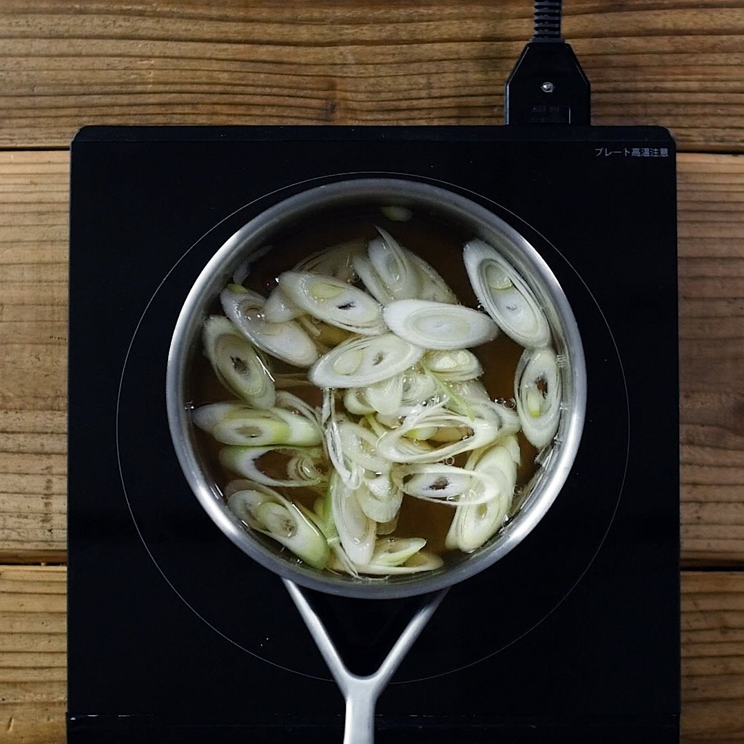 鍋に、(a)を入れて中火にかけます。ひと煮立ちしたら長ねぎを加えてさっと煮ます。