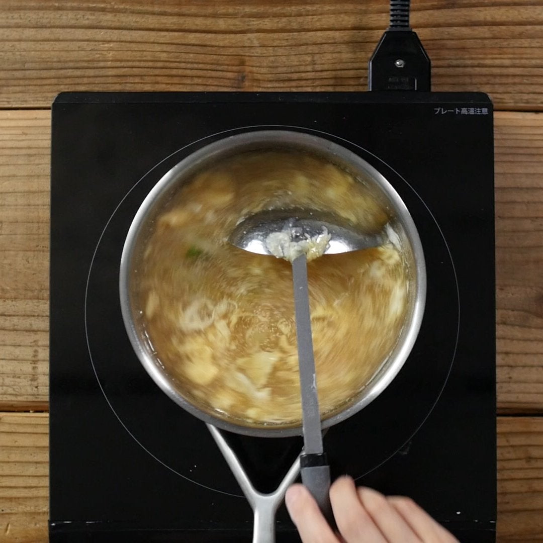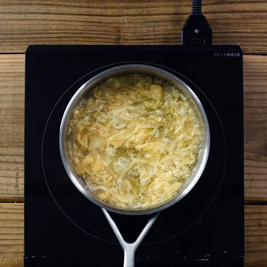 再沸騰させ、溶き卵をゆっくりと流し入れて火を止めます。