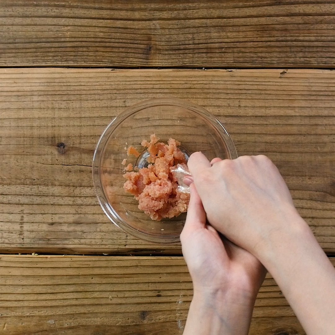 明太子はボウルにしぼります。※トッピング用に少量残しておいてください。