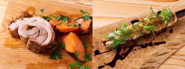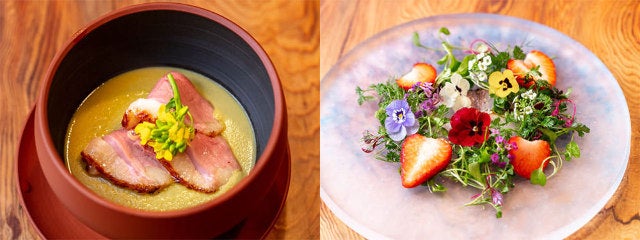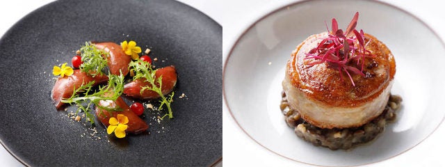 また、ホロホロ鳥を1羽まるごと余すところなく使用した「ホロホロ鳥のガランティーヌ」(写真上・右)は、さまざまな部位を使って作られているため、口に運ぶたびに異なる食感や味わいを楽しめる。