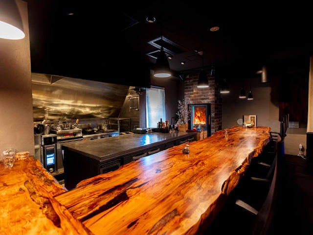 店内に入ると、屋久杉の丸太の一枚板で作られたカウンターがドーンと鎮座。その奥に、薪ストーブが設置されており、薪火で焼き上げたビスティッカ(ステーキ)などをメインに薪火料理を提供している。