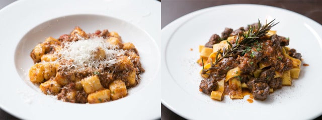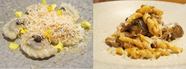 「アンダリノス イノシシの煮込みソース」(写真上・右)は、一つひとつ丁寧にカールを作ったパスタに、サルディーニャのワインで煮込んだ羊のラグーが実によく絡んでいる。どちらも抜群の美味しさだ!