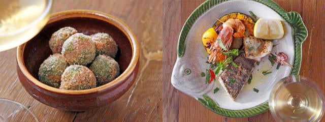 串に巻き付けた太刀魚(写真上・右)は、バルサミコやハーブ、ピンクペッパーでイタリアンらしい味付けに。
