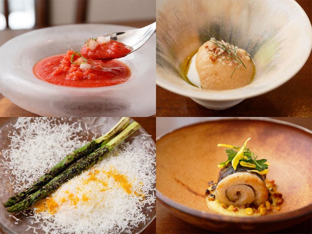 また、前菜の「グリーンアスパラガス ペコリーノ・ロマーノ ボッタルガ」(同・下左)は、半熟卵、チーズ、ボッタルガの上に、色鮮やかなアスパラガスのソテーが並べられた一皿。さらに季節の魚をロール状に巻いて焼いた前菜『カマスのロートロ トウモロコシ ハーブ風味』はクオリティ、ボリュームともに最強の料理だ。