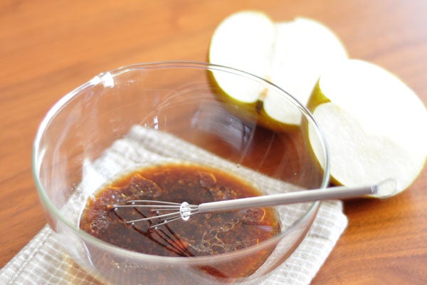 タレづくりは簡単。調味料と梨のすりおろしを混ぜるだけでおいしく肉もやわらかく仕上がります。