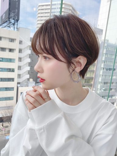 丸みシルエットのスタイルがベースになりますが、前髪を目にかかる程度の長さに設定することで、大人感を備えた旬スタイルに仕上がります。特におすすめは、大人感の中にほんのりキュートさを醸してくれる切りっぱなし風のスタイル。ショートボブっぽいラフな雰囲気に仕上がりつつも、しっかり耳を出すことでレディな印象に仕上がります。