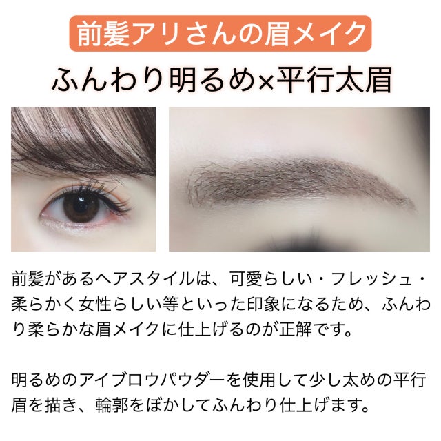 前髪があるヘアスタイルはキュートで若々しく女性らしい雰囲気になるため、眉メイクもふんわりと柔らかな眉に仕上げるとヘアスタイルとの一体感が出て垢抜けます。