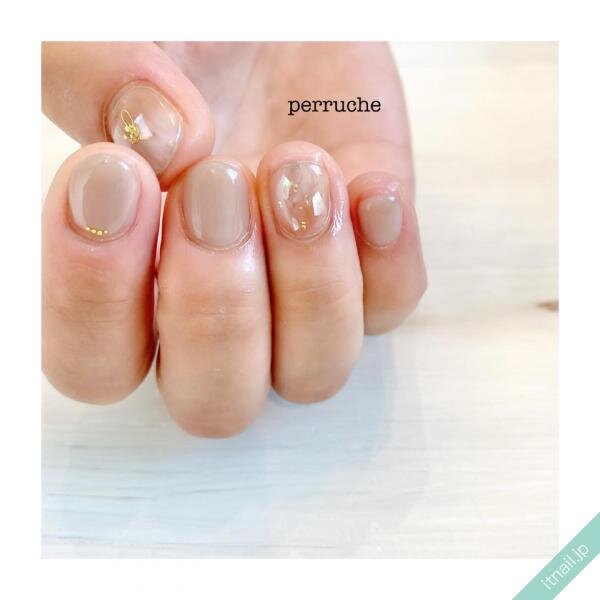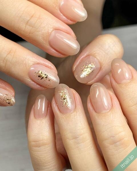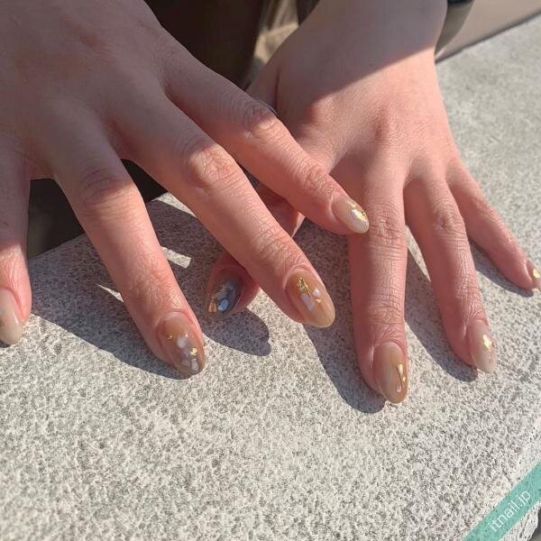 肌なじみのいいミルクティーカラーだから、グラデーションデザインにして品よく仕上げるのも◎。根元にクリアがある分、大人っぽい印象が引き立ちます。ゴールドの輝きをのせたポイントアートも華麗。