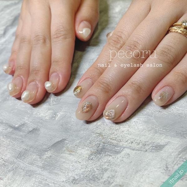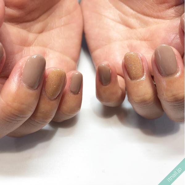 ミルクティーカラーとブラウン系のラメカラーをかけ合わせたシンプルなスタイル。あたたかみのある配色に抜け感が加わった程よいバランス感。セルフネイルにもおすすめのデザインです。