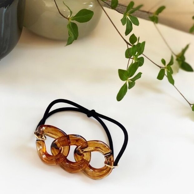 大きなべっ甲チェーンデザインがおしゃれな、存在感たっぷりのべっ甲ヘアゴム。髪を結ぶときに使うだけで、一気に素敵なヘアスタイルが完成します。