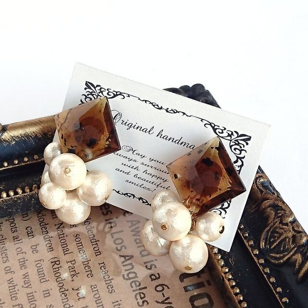 スクエア型にカッティングされたべっ甲とたっぷりのパールが、立体感があってとてもゴージャス。金属パーツは変更可能なので、ピアスホールがない方でも気軽に購入できますよ!