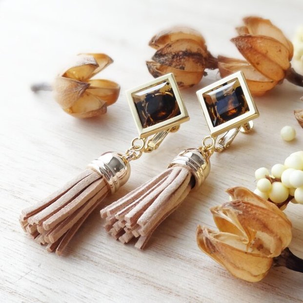 大人シックなべっ甲パーツに、秋らしいミルクティ―カラーのタッセルを組み合わせたおしゃれなピアス/イヤリング♡つけるだけで一気に季節感のある装いに仕上がります。