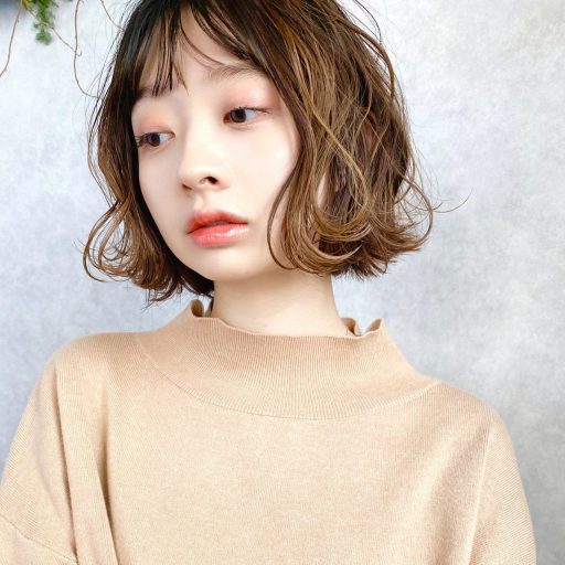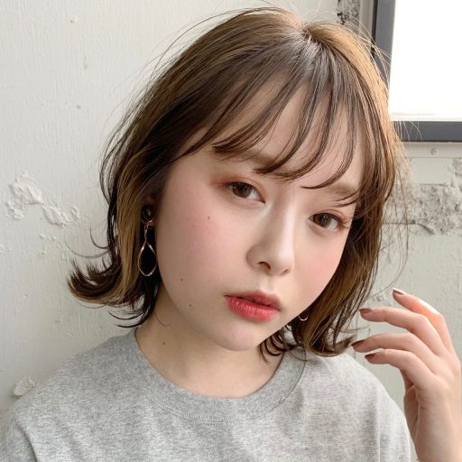 ぱつんと眉ラインで前髪をカットした切りっぱなしボブは抜け感のあるミルクティーベージュの髪色とランダムに巻いたウェーブが相まってフェミニンなカジュアルコーデにしっくり馴染みます。なお、前髪をつくるときは幅をせまめに設定することが小顔感を高めるポイントです。